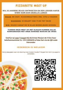 Zondag 10 maart zijn de jongeren vanaf de 1e klas middelbare school welkom om gezellig elkaar en Marjan De Vries te ontmoeten. Wil jij andere jeugd ontmoeten en een lekker hapje eten? Kom dan gezellig langs!